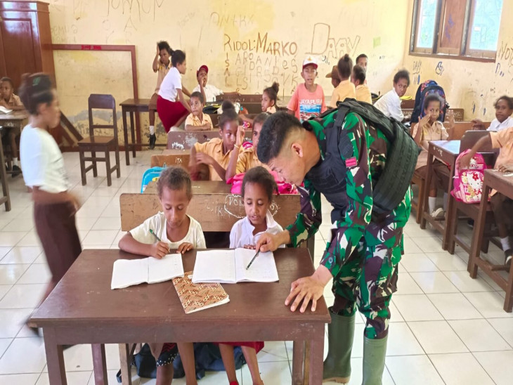Kab.Keerom – Dalam rangka mencerdaskan generasi penerus bangsa, Satgas Pamtas Yonif 132/BS membantu mengajar siswa SD Inpres Pir-V di Distrik Maneem, Kab.Keerom pada Hari Senin (14/11).
